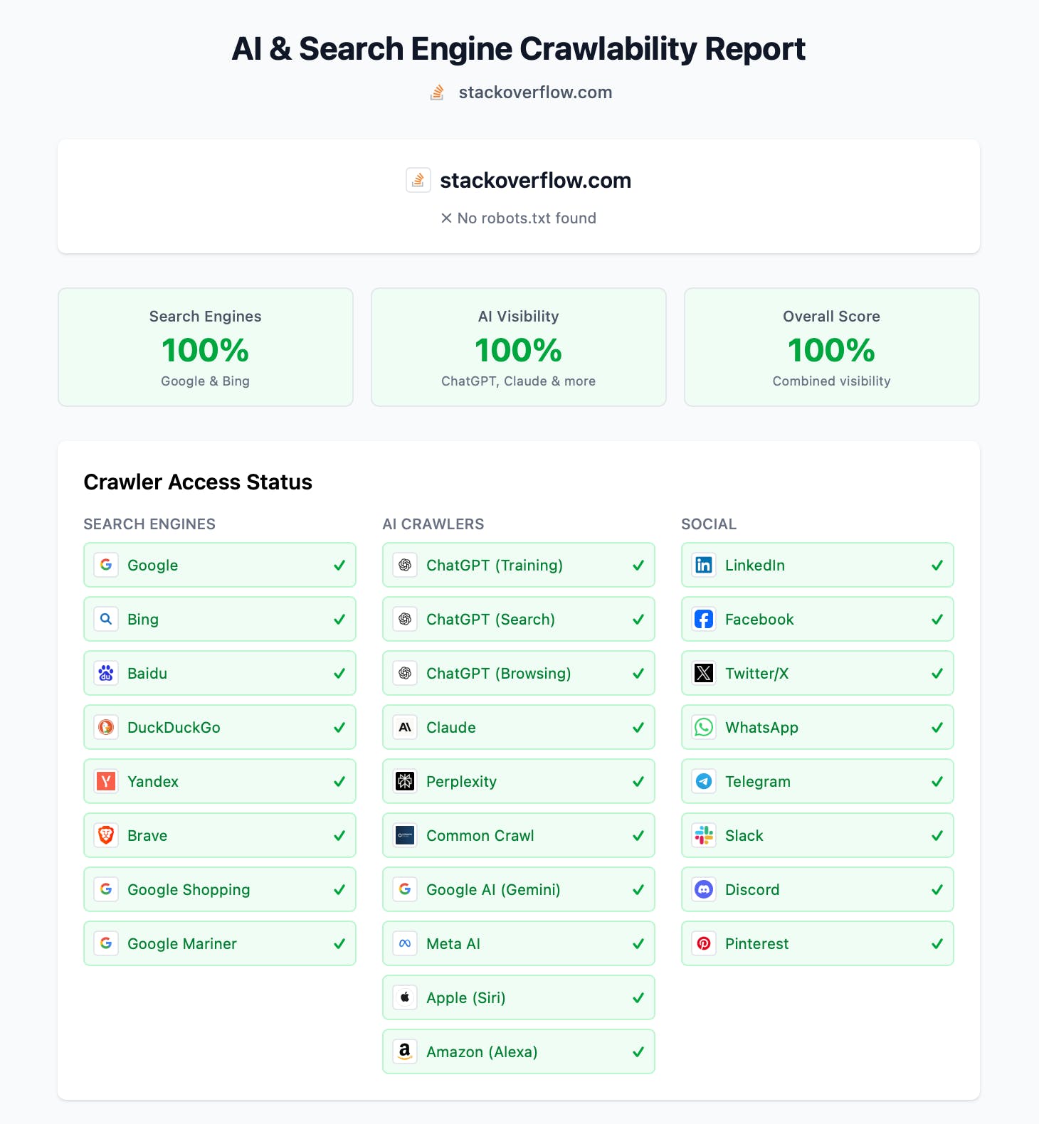 Check if ChatGPT, Claude, and Google can crawl your site in 10 seconds. Find and fix robots.txt issues blocking AI visibility.