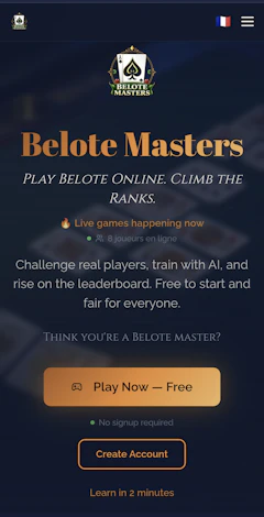 Play Belote for free online! Features: AI training, ELO ranking, and 2v2 multiplayer tournaments. Available on Web and Android (Steam coming soon). Belote Masters is a clean, ad-free experience built for the community. Join the best Belote game of 2026!