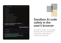 Turn end-users' browsers into AI code sandboxes. BrowserPod runs AI-generated code securely client-side without cloud compute, directly on the browser. Launch instant, interactive demos of your projects and share them over private link without data leaving your users' device. Built for web-based AI applications, BrowserPod can reduce the cost of AI code execution by up to 94%. Now bundled with support for git, bash and other major command line tools, and supporting most Node.js frameworks.