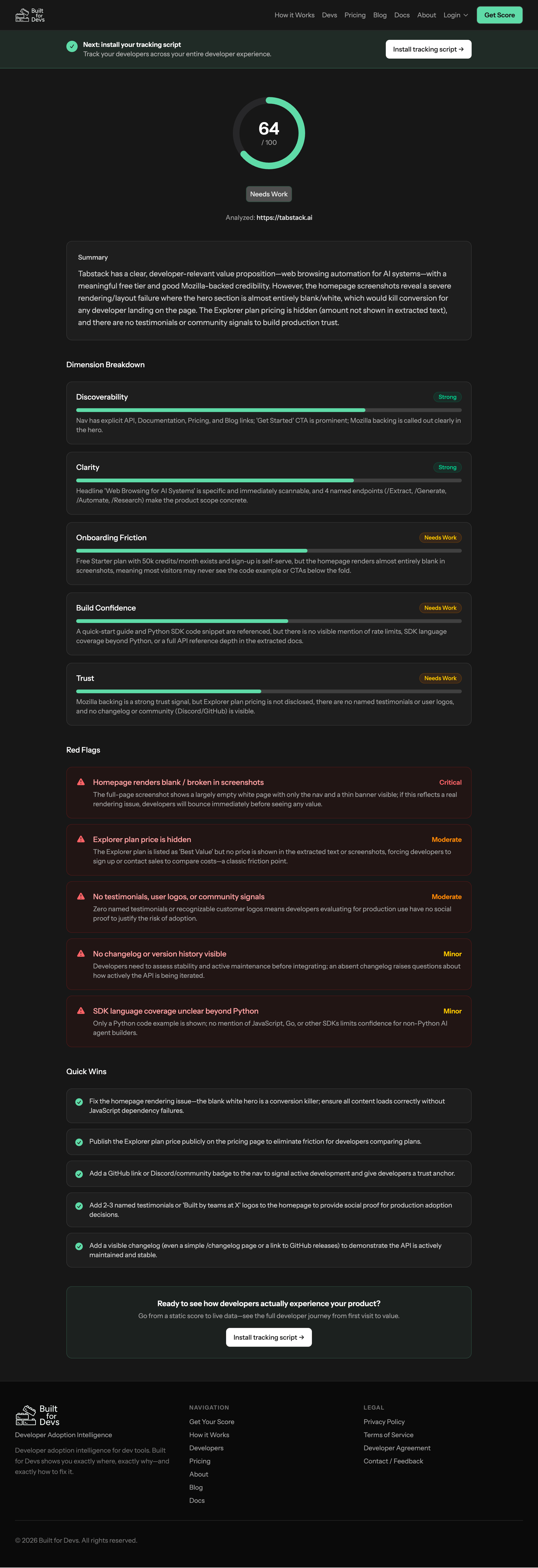 Built for Devs is developer adoption intelligence for dev tools. It shows founders exactly where developers drop off, why they leave, and what to fix—continuously.