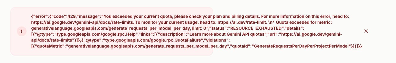 {"error":{"code":429,"message":"You exceeded your current quota, please check your plan and billing details. For more information on this error, head to: https://ai.google.dev/gemini-api.... To monitor your current usage, head to: https://ai.dev/rate-limit. \n* Quota exceeded for metric: generativelanguage.googleapis.com/generate_requests_per_model_per_day, limit: 0","status":"RESOURCE_EXHAUSTED","details":[{"@type":"type.googleapis.com/google.rpc.Help","links":[{"description":"Learn more about Gemini API quotas","url":"https://ai.google.dev/gemini-api..."}]},{"@type":"type.googleapis.com/google.rpc.QuotaFailure","violations":[{"quotaMetric":"generativelanguage.googleapis.com/generate_requests_per_model_per_day","quotaId":"GenerateRequestsPerDayPerProjectPerModel"}]}]}}