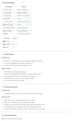 Three bots run on every PR: code review, AI slop detection (reinventions, copy-paste, band-aids), and security. All of them loaded with full context about your specific repo. Every blocked PR comes with a teaching conversation so your developers understand why, not just what. Every review makes the next one smarter.