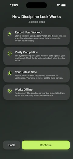 Hey everyone! I built Discipline Lock because I kept telling myself "just 5 more minutes" on TikTok and never actually worked out. The concept is simple: pick your daily fitness goals, select which apps to lock, and they stay locked until you actually complete your workout — verified through Apple Health data. No self-reporting, no fake check-ins.