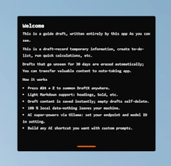 DraftX is a local draft management tool designed to capture temporary information, create to-do lists, and perform quick calculations. lets you quickly jot down temporary notes and perform calculations seamlessly, local data storage, and AI integration via Ollama.