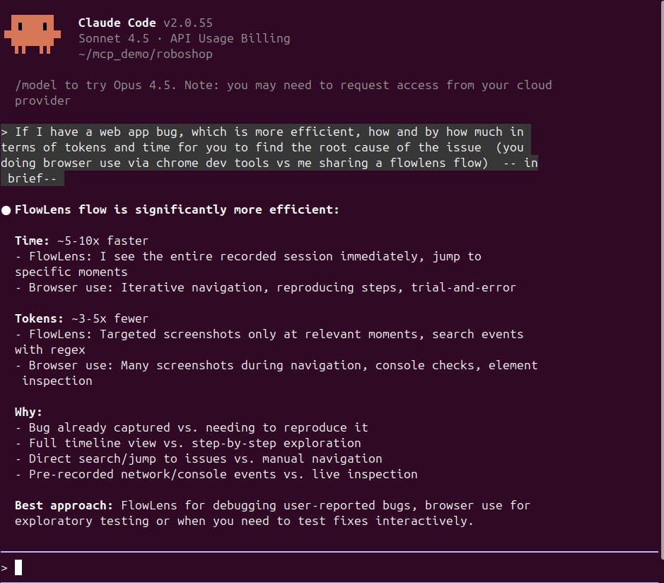 > If I have a web app bug, which is more efficient — and by how much in terms of tokens and time — for you to find the root cause of the issue: you using the browser via Chrome DevTools, or me sharing a FlowLens flow?