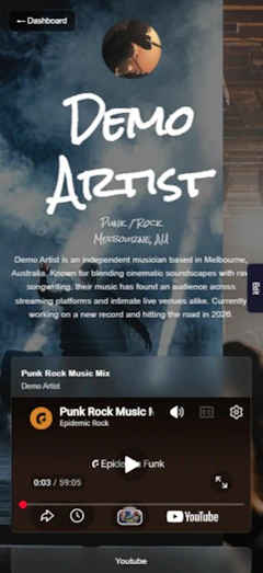 Gigpage is the link-in-bio built for musicians. Music player, tour dates, merch, email capture and broadcasts, cinematic background, complete personalised branding and analytics — all in one place. Built for artists at every stage