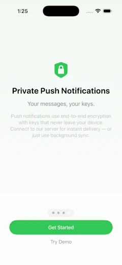 Privacy is the foundation, not a feature. Push notifications are end-to-end encrypted using keys generated on your device that never leave it. There is no intermediary server to process messages. Our options push notifications server only ever sees sealed, encrypted blobs we literally can't read your messages. No accounts, no analytics, no third-party SDKs.