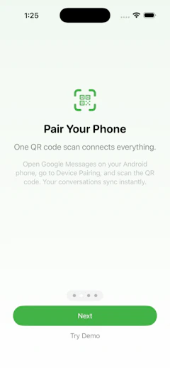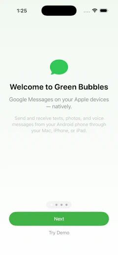 Green Bubbles is a native app that brings Google Messages to macOS and iOS. One QR scan (or Google Account Login) from your Android, and your conversations just show up: texts, photos, voice messages, reactions, typing indicators with push notifications that arrive instantly even when the app is closed.