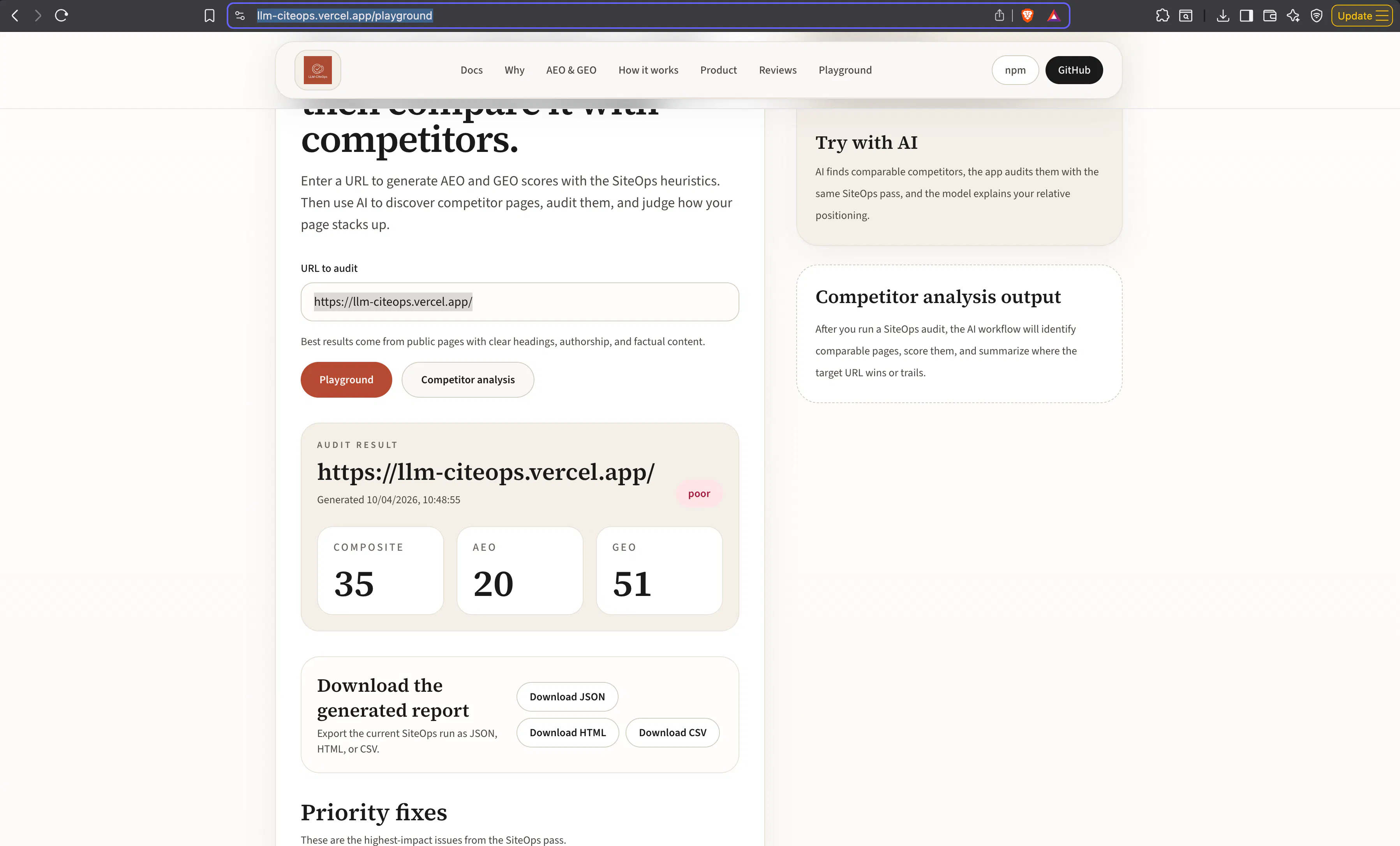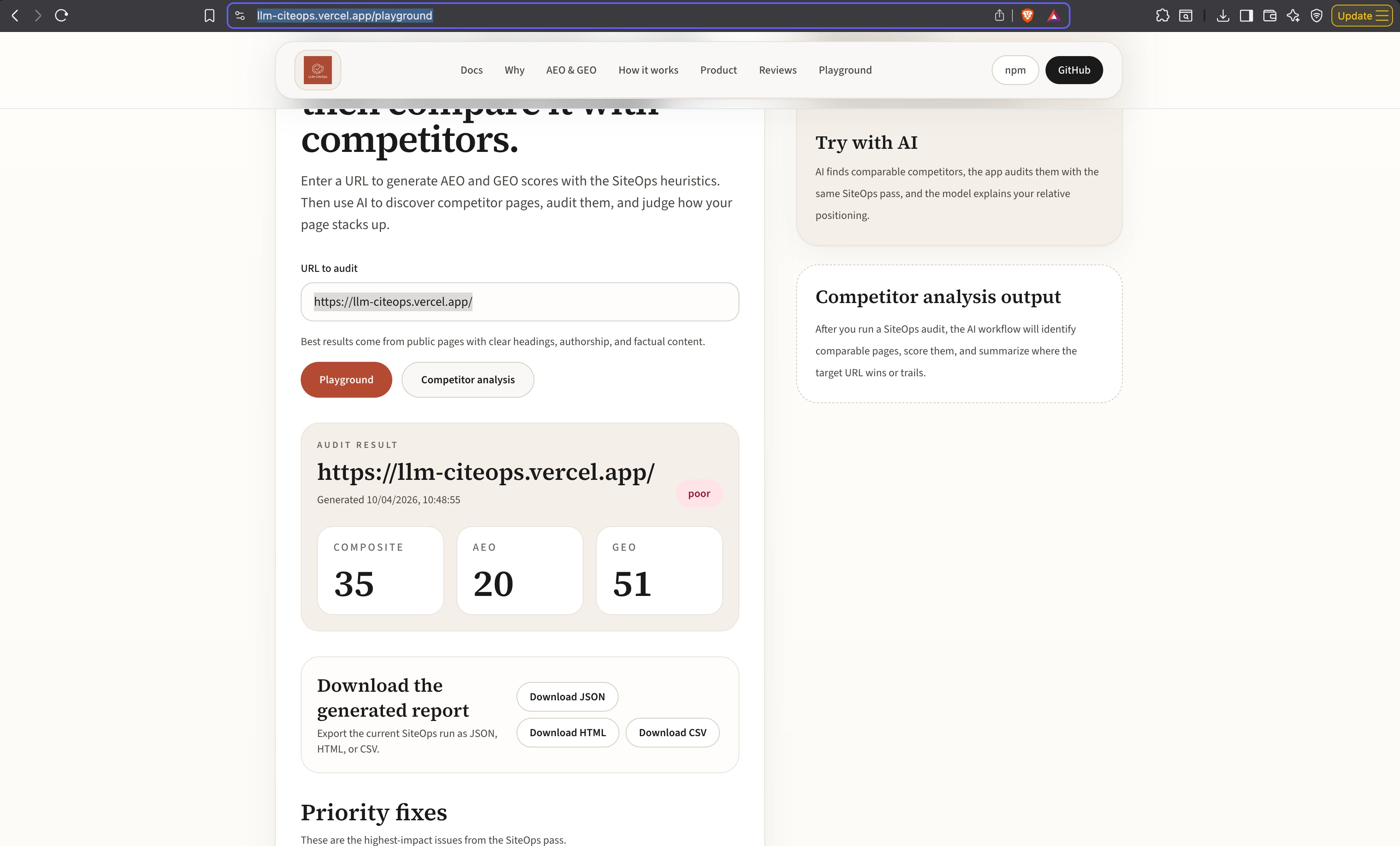 Free CLI for Node.js. Score pages for answer-ready content (AEO) and AI trust (GEO). Print HTML, JSON, or CSV. Fail CI when scores slip.