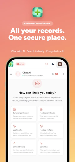 Upload, store, search and understand your medical documents with AI. Secure storage, AI-powered search, and family sharing - private by design. Start for free.