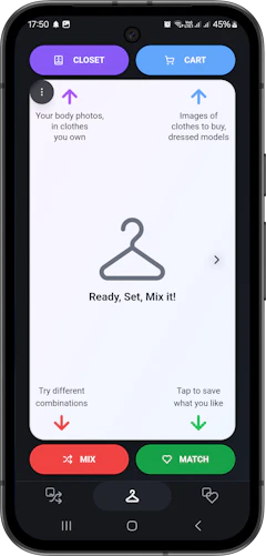 Ever bought clothes online only to find they don't suit you? MIX&MATCH fixes that. Upload a photo of yourself in Closet, add clothing items to your Cart, and tap Mix — our AI generates a realistic image of you wearing the outfit. Save your favorites as Matches, schedule outfits for the week, and build a digital wardrobe. Works with any body type, any pose, any background. No more guessing, see it on YOU before you buy. Available on Android and web.
