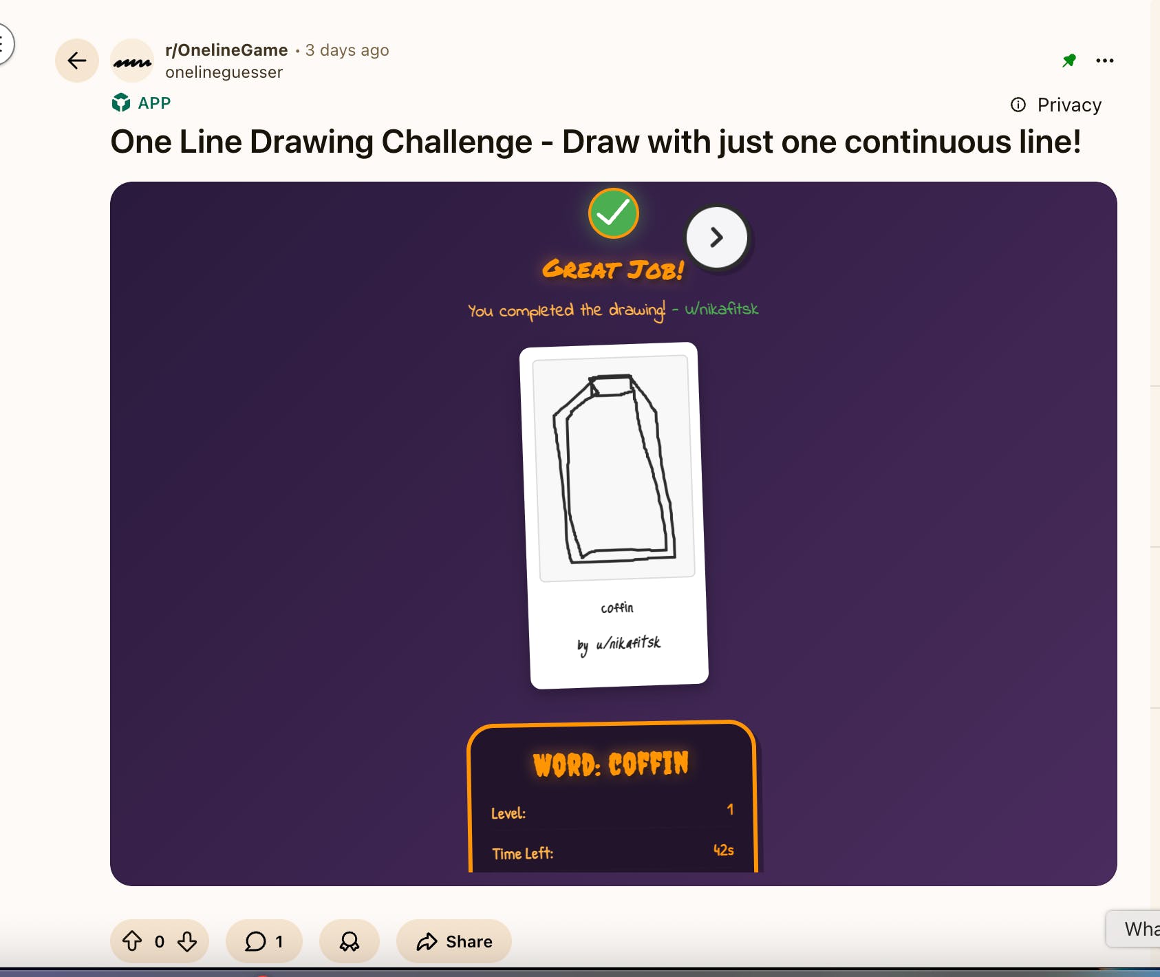 The inspiration for this game came from wanting to create a more relaxed and casual drawing experience that wasn't focused on who is the best artist. The idea was simple: almost anyone can draw one line, and if it looks great, that's awesome - but if it looks terrible, that's part of the fun too. Traditional drawing games often intimidate people who don't consider themselves artists, but with the one-line constraint, everyone starts on equal footing. It's about creativity within constraints, not artistic perfection.