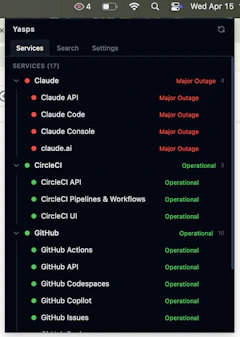 YASPS — Yet Another Status Page Service. Monitor service outages and broadcast incidents to your team in real time. See via a menu bar app whether services you're interested in is experiencing an outage.