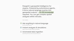 PangeAI is an agentic layer over geospatial data: satellite imagery, vector geometries, coordinate systems. You can answer physical-world questions without a GIS team. "Which of my 400 sites flooded last month?" Minutes, not weeks. Built between Silicon Valley and Europe