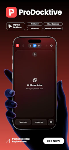 ProDocktive launched on Product Hunt on April 22nd, 2026 and earned 72 upvotes and 1 comments, placing #27 on the daily leaderboard. Dock your iPhone. Unlock a desktop. ProDocktive extends your iPhone to any AirPlay or USB-C display — powering a full desktop experience using your phone's CPU and GPU. Your phone becomes the screen, the trackpad, the air mouse, and the hand tracker.