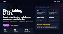 SBTI Test was submitted on Product Hunt and earned 0 upvotes and 1 comments, placing #158 on the daily leaderboard. SBTI is a behavior-based personality test built around the tiny everyday moments that actually reveal you: vague texts, group chats, boundaries, deadline rituals, airport habits, and “just browsing” at Costco. It matches you to an archetype that’s meant to feel uncomfortably specific. It’s not clinical or diagnostic—just entertainment with suspiciously good pattern recognition. Take the test, share your result, and tell us what it got painfully right (or hilariously wrong).