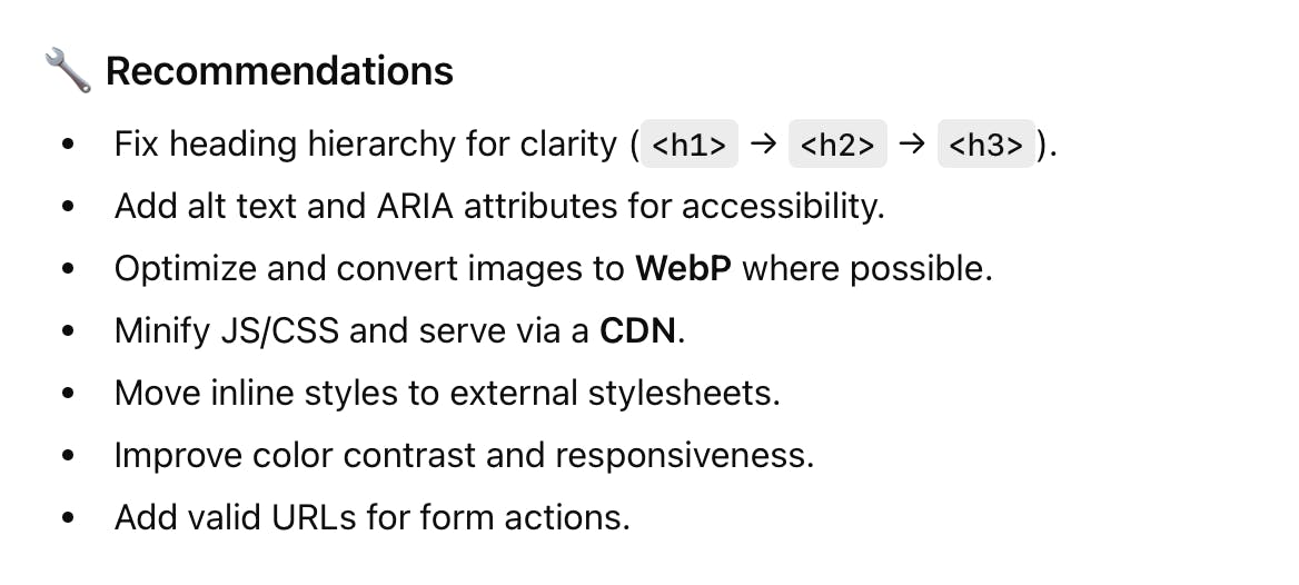 - Flags poor metadata & HTML hierarchy (titles, headings, etc.)