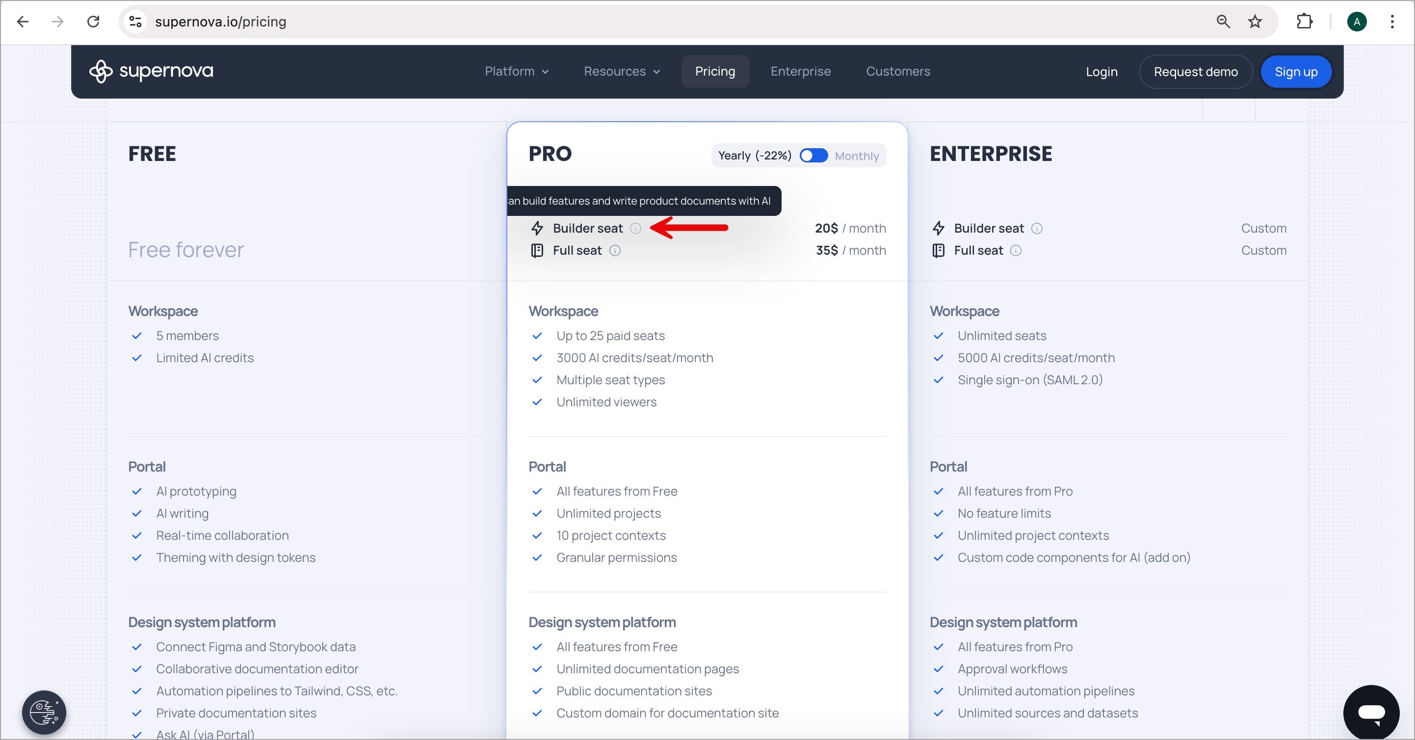 Spotted a tiny UX slip on the Supernova pricing page. The tooltip for 'Builder seat' seems to spill over the plan card and gets cut off visually. Happens when you hover over the tooltip (screenshot attached)