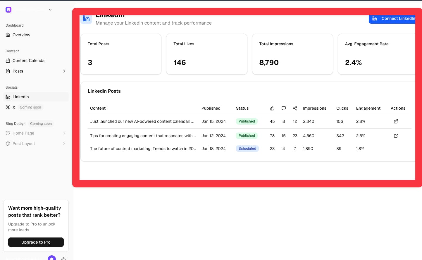 2) It's really strange to have these "metrics" + sample posts that lead nowhere when I haven't connected my Linkedin account