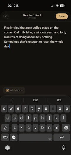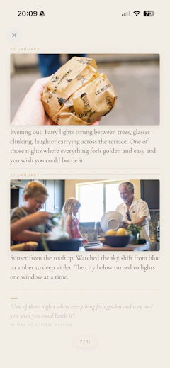 Have you ever felt like journaling apps just end up sitting on your phone, empty? Or that you find it hard to keep in touch with your friends and family? I wanted to change this, and being new to app building, I tried lots of journaling apps. Most journal apps are just a list of entries that you never look back at. I thought, what if your writing became something you'd actually want to read back or perhaps share to your friends?
