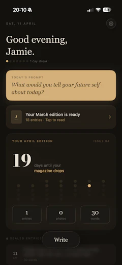 That's Unfold. You write daily, and at the end of each month your entries become a digital magazine with real editorial design, typography, photo layouts, and pull quotes extracted from your own words. It can then be shared with friends or family to update them on your life, or just kept to yourself for a fun way to relive your month and track your goals!