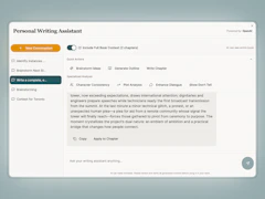 Write and publish professional Books with. Distraction-free editor, intelligent writing tools, and export to ePub, PDF, and DOCX. WriterCasa uses advanced AI models to help you write better. You can ask it to continue your writing, expand ideas, rewrite sections for clarity, shorten verbose text, or brainstorm new concepts. The AI learns your style and provides contextual suggestions while you always remain in control.