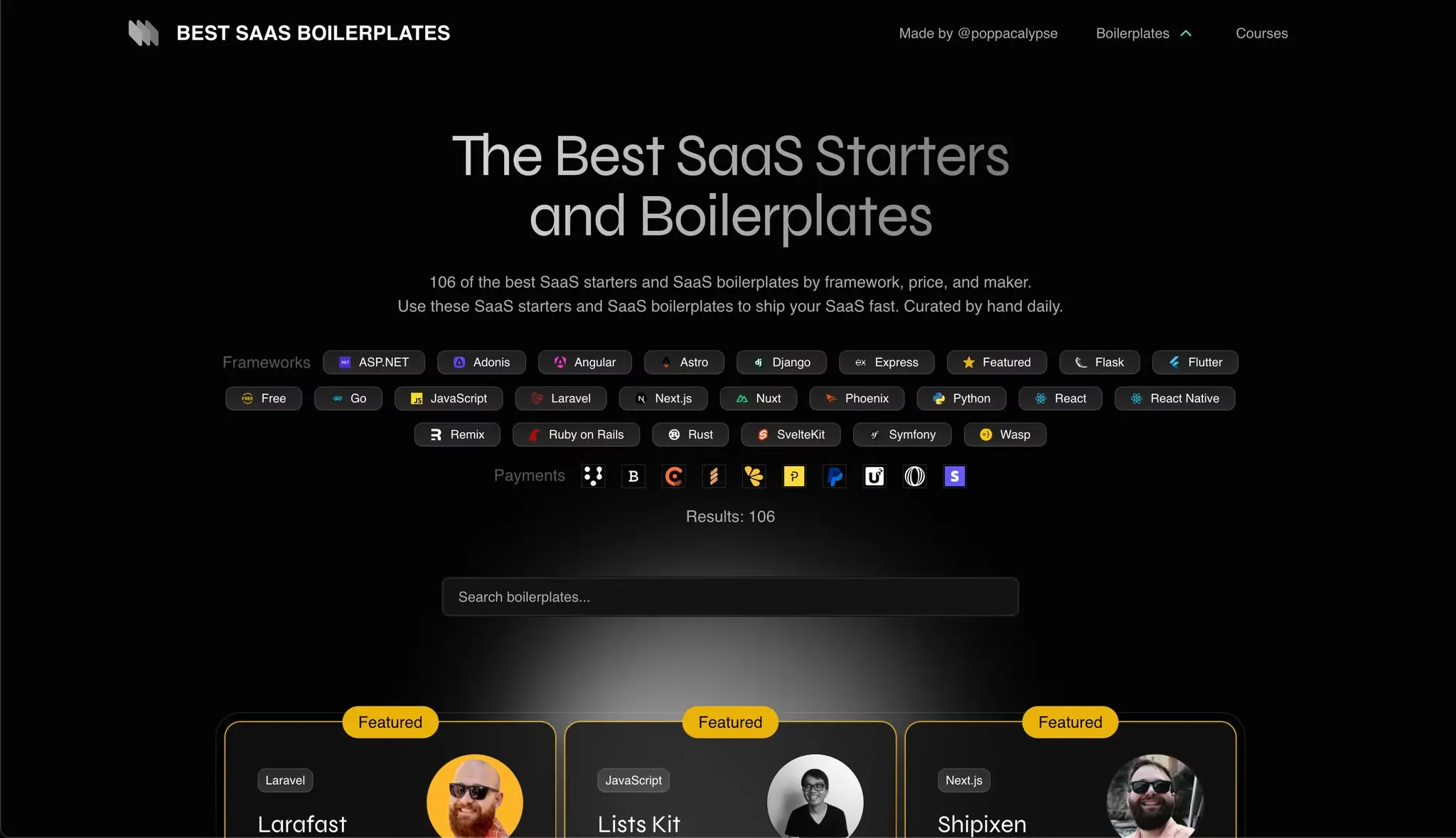 Read more about Best SaaS BoilerplatesBest SaaS BoilerplatesPublished onSeptember 23, 2024A curated directory of 100+ SaaS starters and boilerplates saas developmentboilerplatesstarter kitsweb applicationsstartup tools