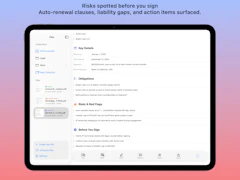 BrieFolio extracts exactly what matters for your document type. Contracts show parties, key dates, risks, and action items. Invoices show vendor, line items, and due dates. Meeting notes show decisions, owners, and open questions. Everything structured, clear, and ready to act on.