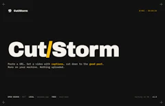 Cut/Storm launched on Product Hunt on April 22nd, 2026 and earned 63 upvotes and 2 comments, placing #36 on the daily leaderboard. Cut/Storm is a self-hosted video editor for short clips. Drop a file or paste a URL, transcribe with Whisper locally, edit the transcript, style captions (karaoke, drag/resize), crop, trim, auto-remove silences, mix extra audio, export MP4 or GIF with burned-in subtitles. Runs as a single Docker container on Linux / macOS / Windows. No cloud, no account, no subscription. 13 fonts baked in. Open source, MIT.