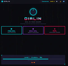 DialIn is a free cyberpunk color memory game. Remember colors, recreate them, and see how close you get. Daily challenges, duels with friends, and discover your color personality.