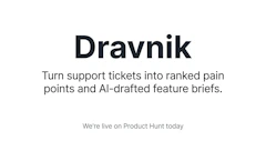 Dravnik was submitted on Product Hunt and earned 1 upvotes and 1 comments, placing #110 on the daily leaderboard. Dravnik turns support ticket chaos into product clarity. Your backlog is full of user pain, buried in 500 tickets nobody has time to read. Dravnik analyzes them in 30 seconds, surfaces the 5 highest-impact pain points, and drafts AI-ready feature briefs you can pin straight to your roadmap. Stop guessing what to build. Let your users tell you.
