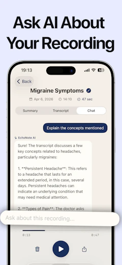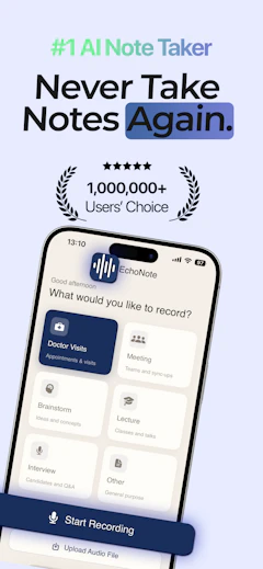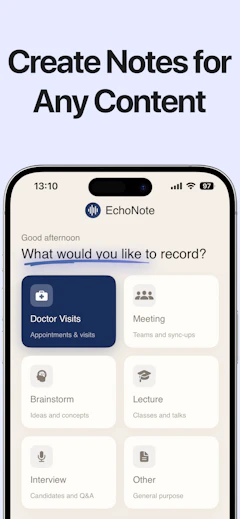 Tired of missing details in long meetings or lectures? EchoNote uses advanced AI to transcribe audio to text, extract key insights, and summarize complex information in seconds. Available in multiple languages with a distraction-free design.