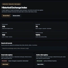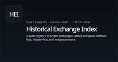 Historical Exchange Index is a public registry for crypto exchanges, active and gone. Instead of focusing on prices, rankings, or trading metrics, it treats exchanges as records with their own identity, timeline, and evidence trail. HEI separates entity, event, and evidence, tracks closures, acquisitions, rebrands, and enforcement-driven shutdowns, and uses archive-aware URL handling for dead-side entries where original domains may no longer be trustworthy.