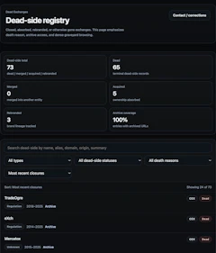The project is structured around three separate layers: the exchange entity itself, major timeline events, and the evidence behind those claims. For dead-side entries, archived URLs matter a lot, because original domains can expire, redirect, get repurposed, or become unsafe over time.