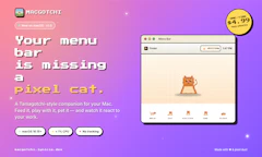 Macgotchi was submitted on Product Hunt and earned 0 upvotes and 0 comments, placing #143 on the daily leaderboard. A Tamagotchi-style pixel cat that lives in your macOS menu bar. Feed it, play with it, pet it, and watch it react to your work. Always one glance away.