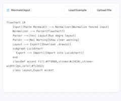 You paste in a Mermaid flowchart, preview it in the browser, and export an editable .drawio file that can be imported into Lucidchart. Fast, easy, no signup.