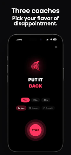 With Put It Back, you start a session, place your phone face-down, and leave it there. If you cave and pick it up early, your coach calls you out immediately. Right now there are 3 voices; Mom, Sergeant and Therapist