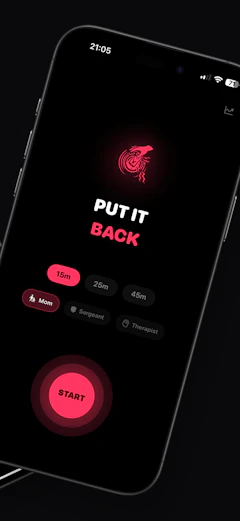 Put It Back is a focus coach with attitude. Start a 15, 25, or 45 minute session, place your phone face-down, and get back to work. If you pick it up too soon, your chosen coach — Mom, the Sergeant, or the Therapist — immediately calls you out. It uses motion and shake detection, tracks streaks and pickups, shows progress on the Lock Screen, and works fully on-device with no account required. It turns focus into a game of not getting caught slipping.