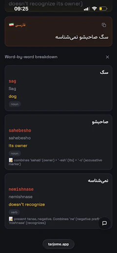 I built Tarjome because I have a Persian partner and kept struggling to truly understand the language, not just get translations, but actually grasp what each word means and does.