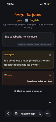 Tarjome goes beyond standard translation: it detects Finglish (Persian written in Latin letters) automatically, handles the informal spellings people actually use in texts and social media, translates instantly, and breaks down each word individually so you understand the language, not just the meaning. Great for language learners! Built by a non-Persian speaker who wanted to actually understand the language, not just translate it. Free, no sign-up needed.