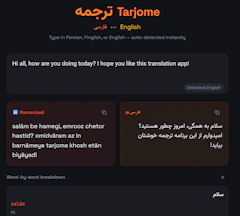 Tarjome was submitted on Product Hunt and earned 3 upvotes and 1 comments, placing #133 on the daily leaderboard. Tarjome goes beyond standard translation: it detects Finglish (Persian written in Latin letters) automatically, handles the informal spellings people actually use in texts and social media, translates instantly, and breaks down each word individually so you understand the language, not just the meaning. Great for language learners! Built by a non-Persian speaker who wanted to actually understand the language, not just translate it. Free, no sign-up needed.