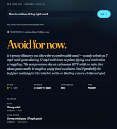 Wyndo is the weather app I wanted. Pick your activity — walk, run, bike, drive, or eat outside — and it scores the next few hours and tells you go, wait, or skip it, with the reasoning right there on screen. Every recommendation cites the weather factors you can already see: precipitation timing, wind, temperature, visibility, alerts. A light drizzle that's fine for a drive gets flagged for outdoor dining.