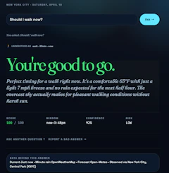 Really smart take on weather. I go stair climbing outdoors a lot and this is exactly the kind of thing I'd check before heading out — "should I go now or wait an hour?" way more useful than staring at percentage bars. The deterministic approach over AI guessing is a solid call too. Any plans for an iOS app or Apple Watch complication? Being able to glance at my wrist before stepping out would be perfect.