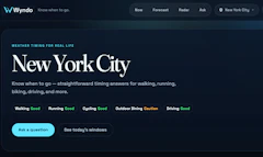 Wyndo launched on Product Hunt on April 19th, 2026 and earned 96 upvotes and 9 comments, placing #11 on the daily leaderboard. Every weather app tells you there's a 60% chance of rain. None of them answer the question you're actually asking: should I go right now? Wyndo is a weather app that answers that question with a direct answer: go now, wait, or skip it Instead of handing you hourly graphs and percent-chance bars, Wyndo scores the next few hours against what you're actually doing — walking, running, biking, driving, or eating outside — and gives you a direct recommendation with the reasoning behind it.