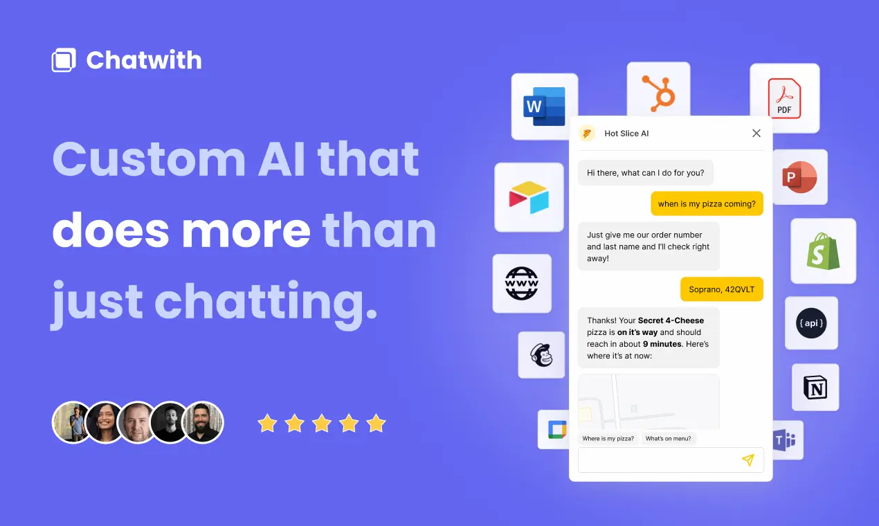 Chatwith is a customizable ChatGPT AI chatbot that can be trained on your website content and files. It's designed for instantly answering questions and resolving customer support queries with AI, and integrates with over 6000 apps without any coding required.