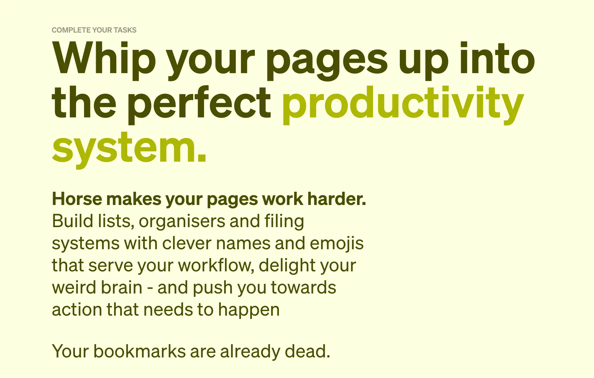 Horse is a minimalist internet browser designed for individuals who value focus, intentionality, and efficient organization. By replacing chaotic tabs and bookmarks with the intuitive Trails® system, Horse empowers you to structure your browsing experience to reflect your priorities and tasks. Whether you're a professional seeking to enhance productivity, an organizer who appreciates a well-structured workflow, or someone overwhelmed by tab overload, Horse offers a unique and empowering way to engage with the internet.