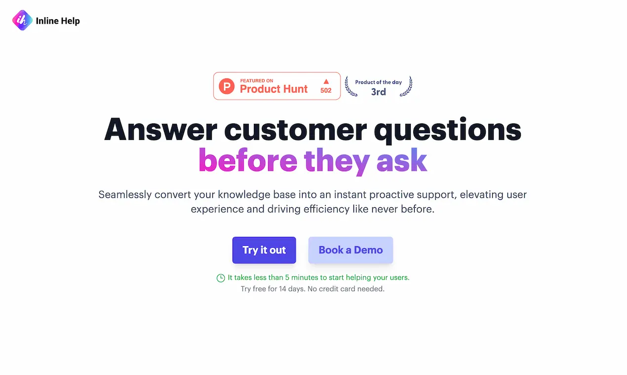 Inline Help is the ultimate solution for providing proactive and efficient support to your users. With its seamless integration, AI-powered insights, and comprehensive support hub, Inline Help empowers you to answer customer questions before they ask, driving efficiency and enhancing user experience like never before. Whether you're a customer support team, product manager, developer, SaaS company, or online business, Inline Help offers the tools and resources you need to elevate your support processes and delight your users.