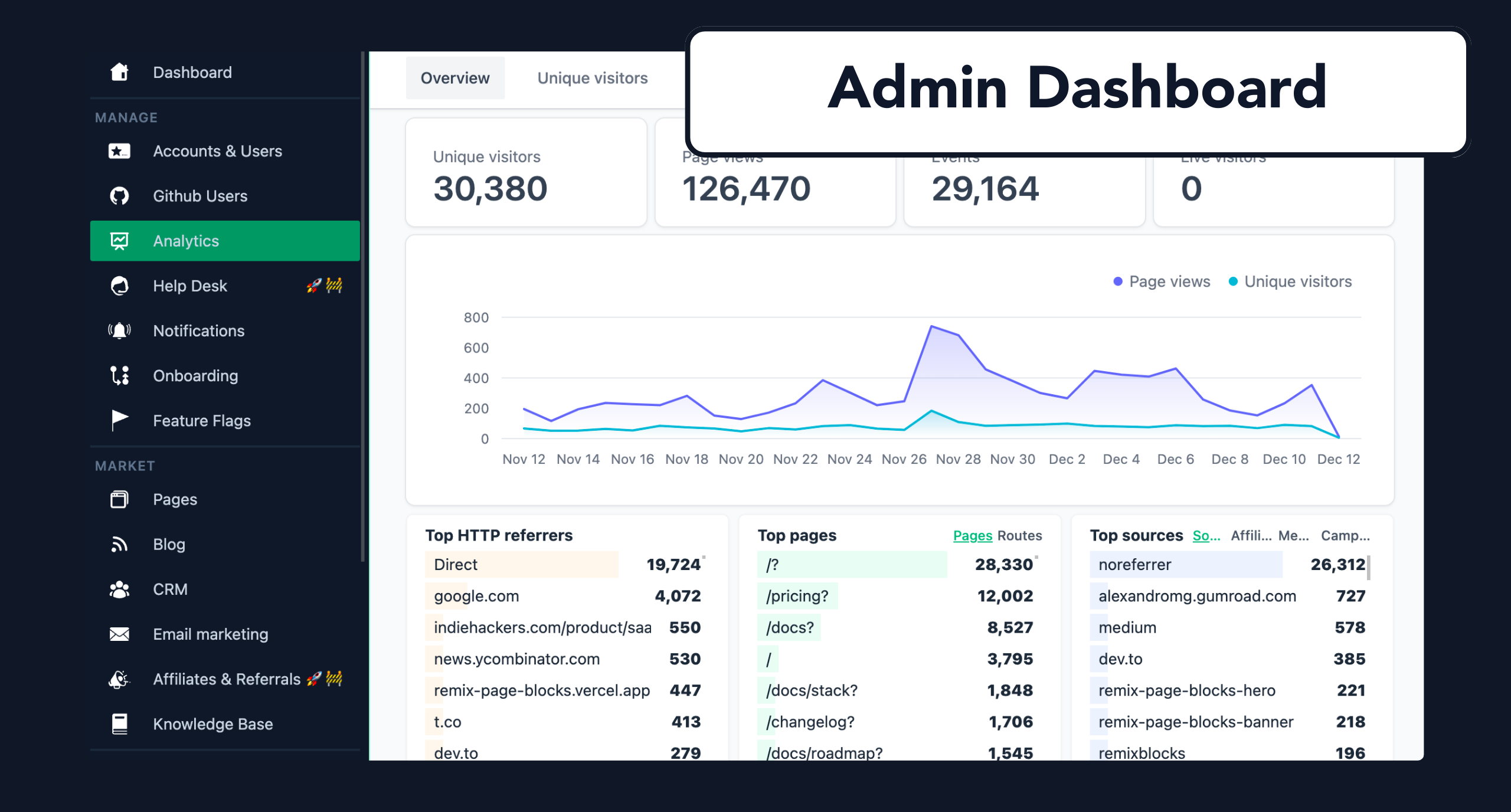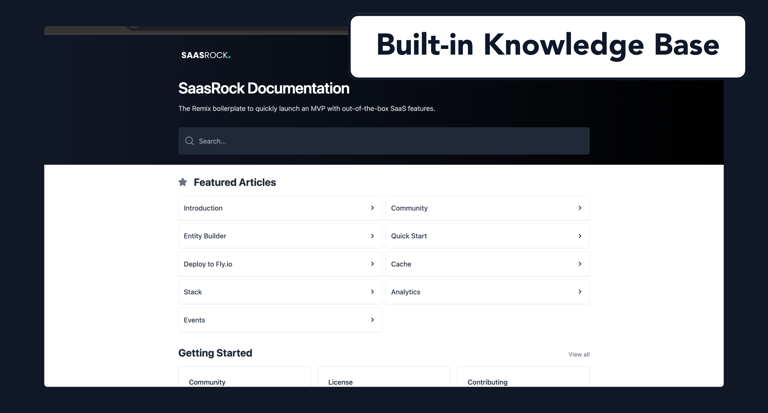 Build your MVP with +25 out-of-the-box SaaS features: Auth, Admin portal, App dashboard, Stripe Subscriptions, Workflows, Blog, Knowledge Base, Entity Builder (CRUD and API), Events, Email Marketing, Page Blocks, Notifications, Metrics, Cache, and more.