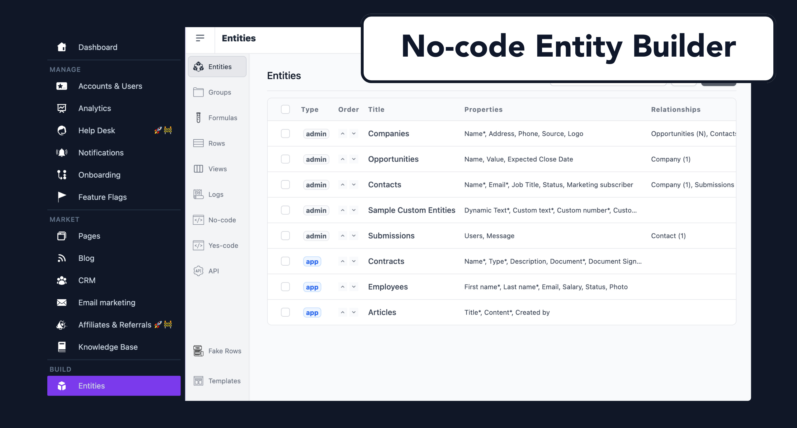 - No-code features: Autogenerated CRUD and API with the Entity Builder