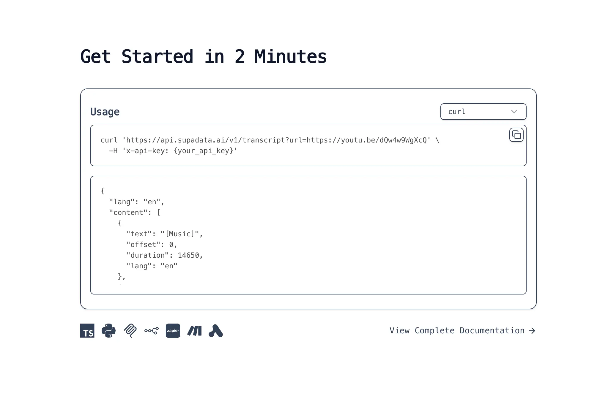 - Clean, Structured Output: Receives well-formatted JSON for transcripts and Markdown for web content, making it easy to process and integrate into applications.